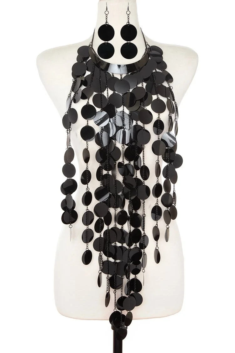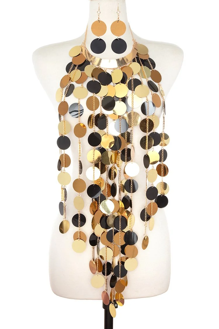Store › Disco Inferno Image 1 of 2 Image 2 of 2 Disco Inferno Sale Price: $34.00 Original Price: $49.00 Dramatic disc curtain necklace — bold swing, bold shine, bold confidence. Color: Black Brown/ivory SOLD OUT Add To Cart Added! Dramatic disc curtain necklace — bold swing, bold shine, bold confidence.