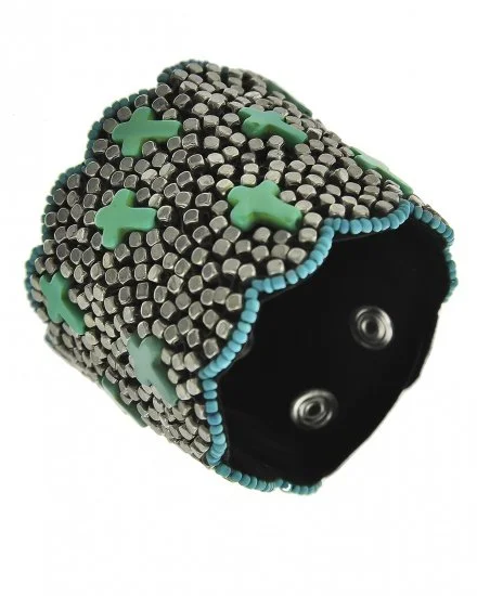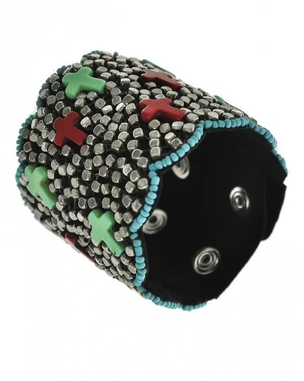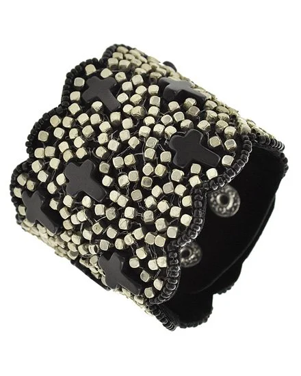 This bold, wide cuff is drenched in metallic bead texture with cross accents that make your wrist the statement. The snap closure makes it easy to wear, and the beaded edge gives it that finished, boutique look. Available in multiple colorways, it’s the kind of piece that upgrades a simple outfit in seconds.