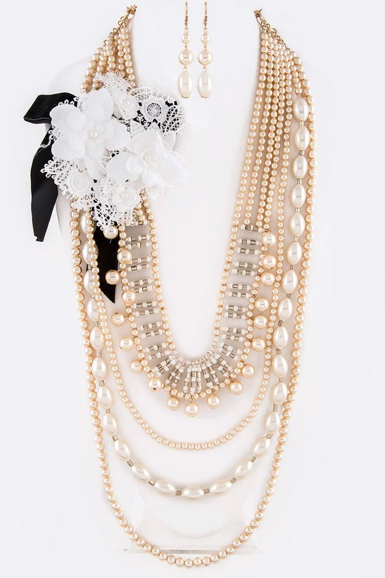 This pearl-forward statement set pairs classic shine with couture detail for a look that feels dressed-up on purpose. The floral lace accent adds a soft, elegant touch that stands out beautifully in photos. Available in multiple colorways for bridal moments, church looks, and classy nights out.