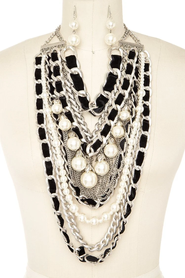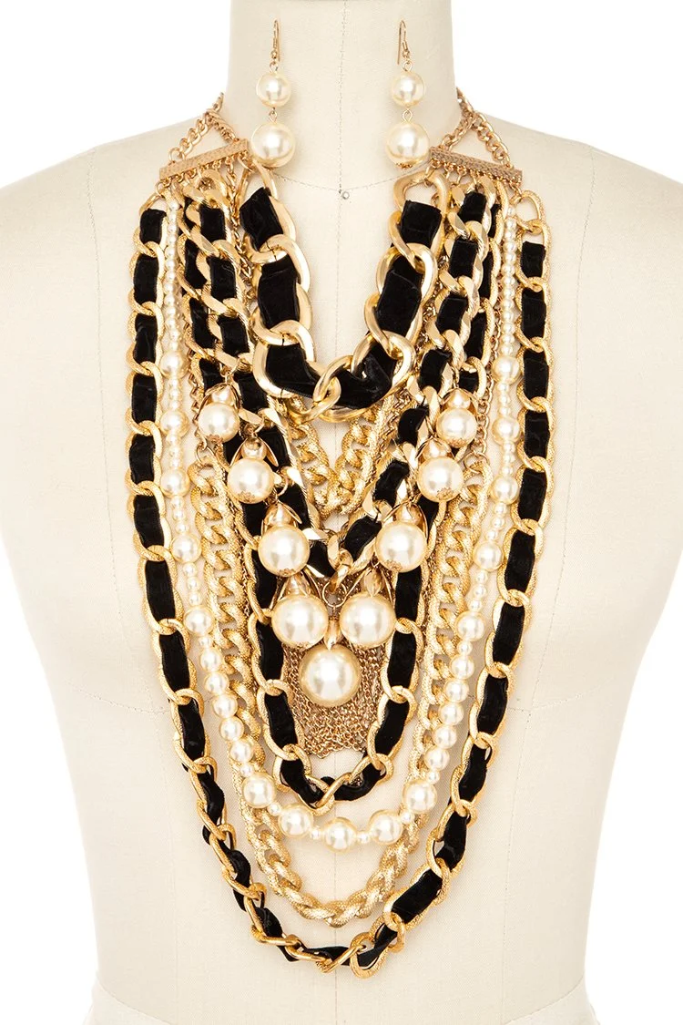 This layered statement set blends pearls, bold chain, and soft velvet detail for a rich, high-fashion finish. It’s dramatic in the best way—perfect when your outfit needs one powerful piece. Available in multiple colorways so you can keep it classic or switch it up.